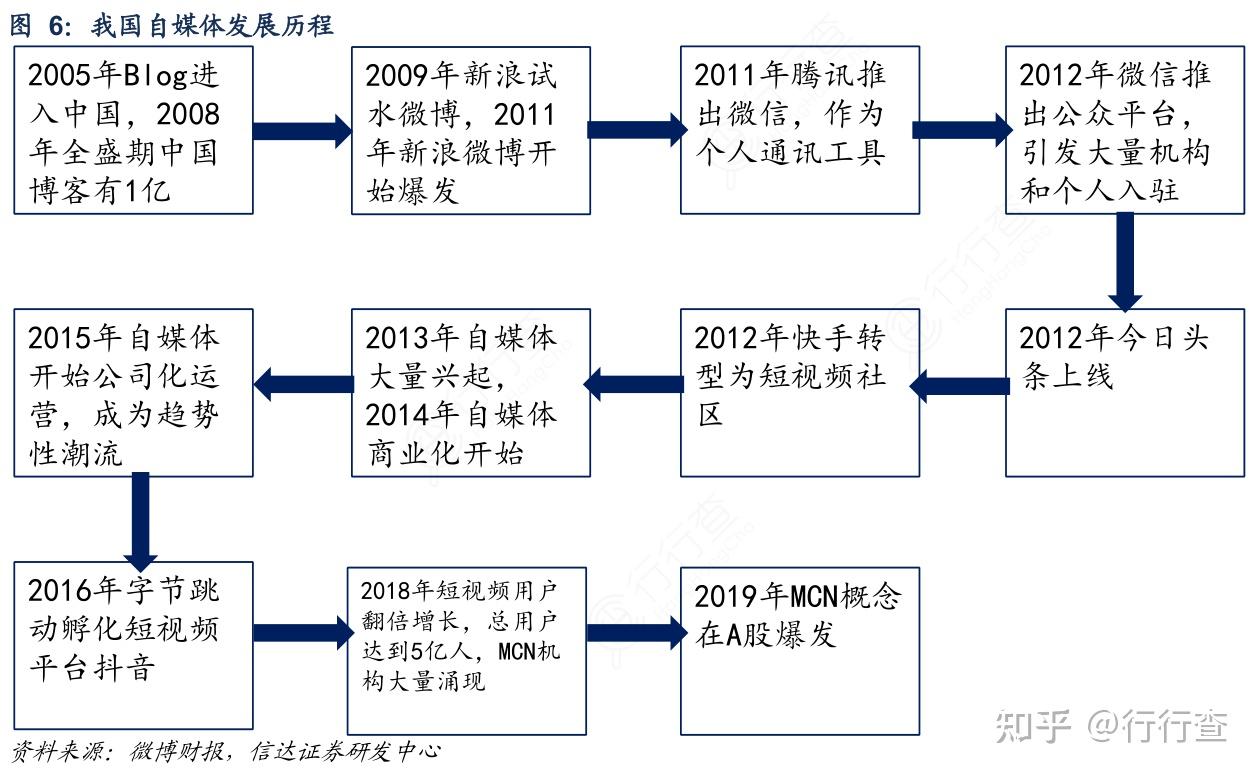 自媒体快速发展,微博等社交媒体平台兴起,UC、今日头条等新闻工具类平台信息流广告增长迅速。2011年微博迎来黄金发展期,MAU在2014年超过2亿,2012年今日头条上线MAU迅速增加,成为新闻类APP T OP1,UC从纯工具类应用转变成半新闻类应用,在2011年MAU为1.67亿,2016年MAU达到2.27亿(questmobile数据),2012年4月微信开通朋友圈,8月发布公众号,互联网流量入口快速增加,自媒体从博客形式进化到社交平台大V、微信公众号等,平台出现专门从事商务运营的MCN机构,如天下秀等,自媒体商业化与2014年左右逐渐成熟。