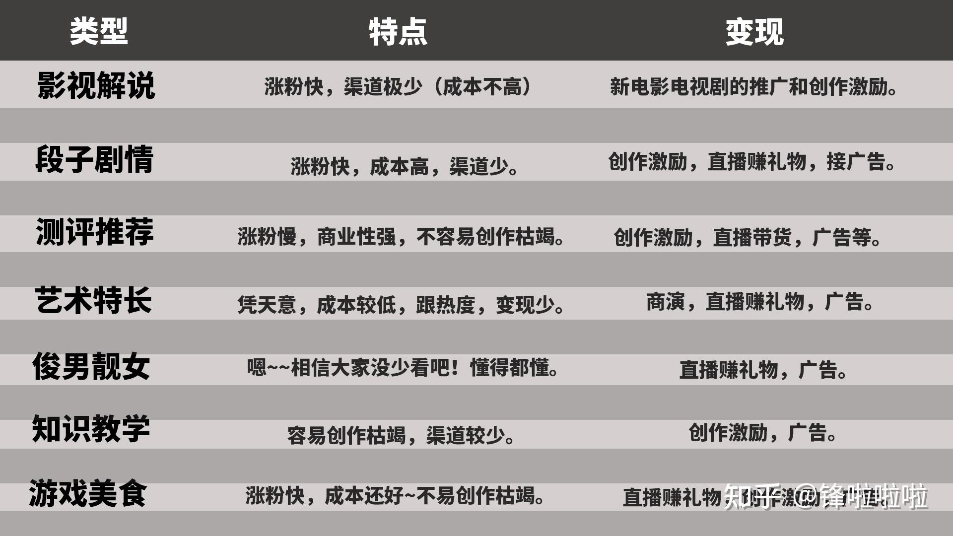 ● 类型:艺术特长——特点:火不火全凭天意,应该成本较低,可以跟着热度拍,不易创作枯竭,变现渠道较少——变现:直播pk赚礼物,广告,商演