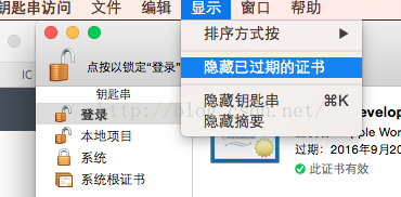 2.打开钥匙串,在导航栏上,依次选择显示-显示已过期的证书,然后删除已经过期的证书