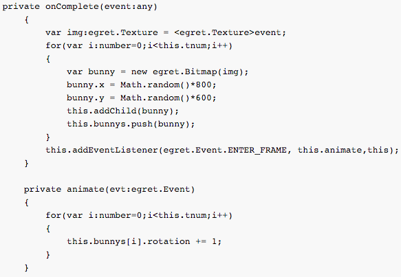 所有引擎编写的代码大致相同,开始做for循环,创建定量显示对象,然后在循环中对每个显示对象做旋转操作。