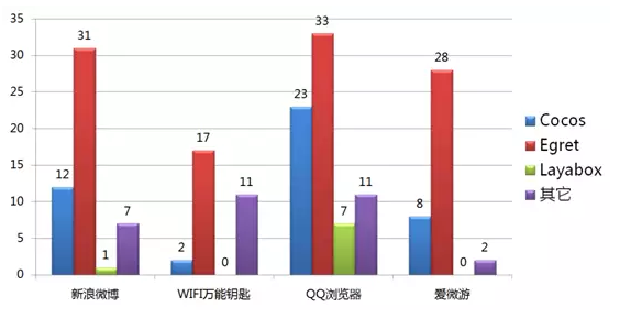 不难看出,Egret 和 Cocos2D-js联合瓜分了大部分市场。而Egret占比居然过半。看来Egret在国内HTML5游戏市场还是非常强悍的。