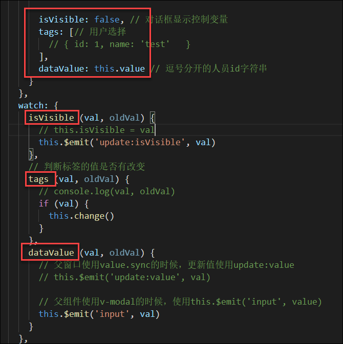 我们定义了几个data变量,以及对几个变量进行watch监控,以便控制它的值的更新和返回,如下代码所示。