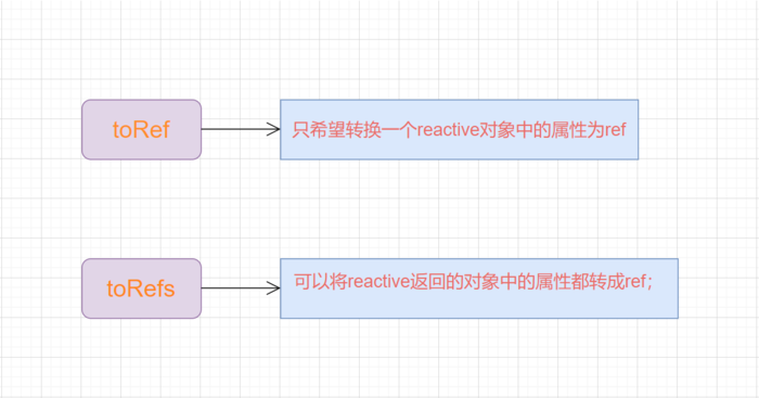 toRef: toRef接收两个参数target和attr,target是一般是reactive的响应式对象,attr是对象的属性,返回响应式变量(采用引用的方式,修改响应式数据,会影响原始数据,并且数据发生改变)