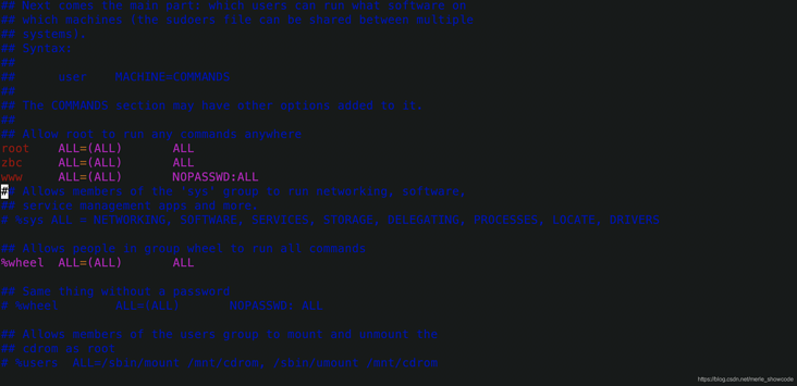 vim 打开 /etc/sudoers 在root下添加一行 www 执行sudo 权限免密码