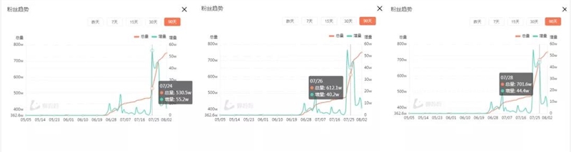 另外,粉丝数量也暴涨。7月24日当天50多万,25日40多万,以后3天每天保持40多万粉丝的增长率,达到700多万。