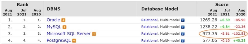 分数波动较大的数据库是微软SQL Server,分数较上月下降8.61分,较去年同期下降102.53分。也是整个榜单中分数下降幅度更大的数据库。