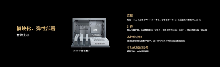 其中,“1”升级为集连接、计算、存储和智能服务于一体的全新智能主机,就像一个智慧大脑,拥有高集成、稳定连接、安全、主动智能等突出优势,让全屋运转井然有序。智能主机的升级点具体表现为:实现有线(PLC)无线(Wi-Fi)一体化、窄带宽带一体化,电信级稳定性可高达99.99%,稳定畅连;算力可实现K级、兆级到百兆级按需扩展,快速响应;采用本地化存储,端到端加密,更好地保护家庭数字资产;除此以外,还支持断网可控、本地场景联动等本地化智能服务。
